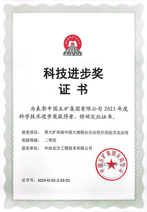 此外,中冶北方独立完成的“厚大矿体高中段大规模安全高效开采技术及应用”项目获科技进步二等奖。